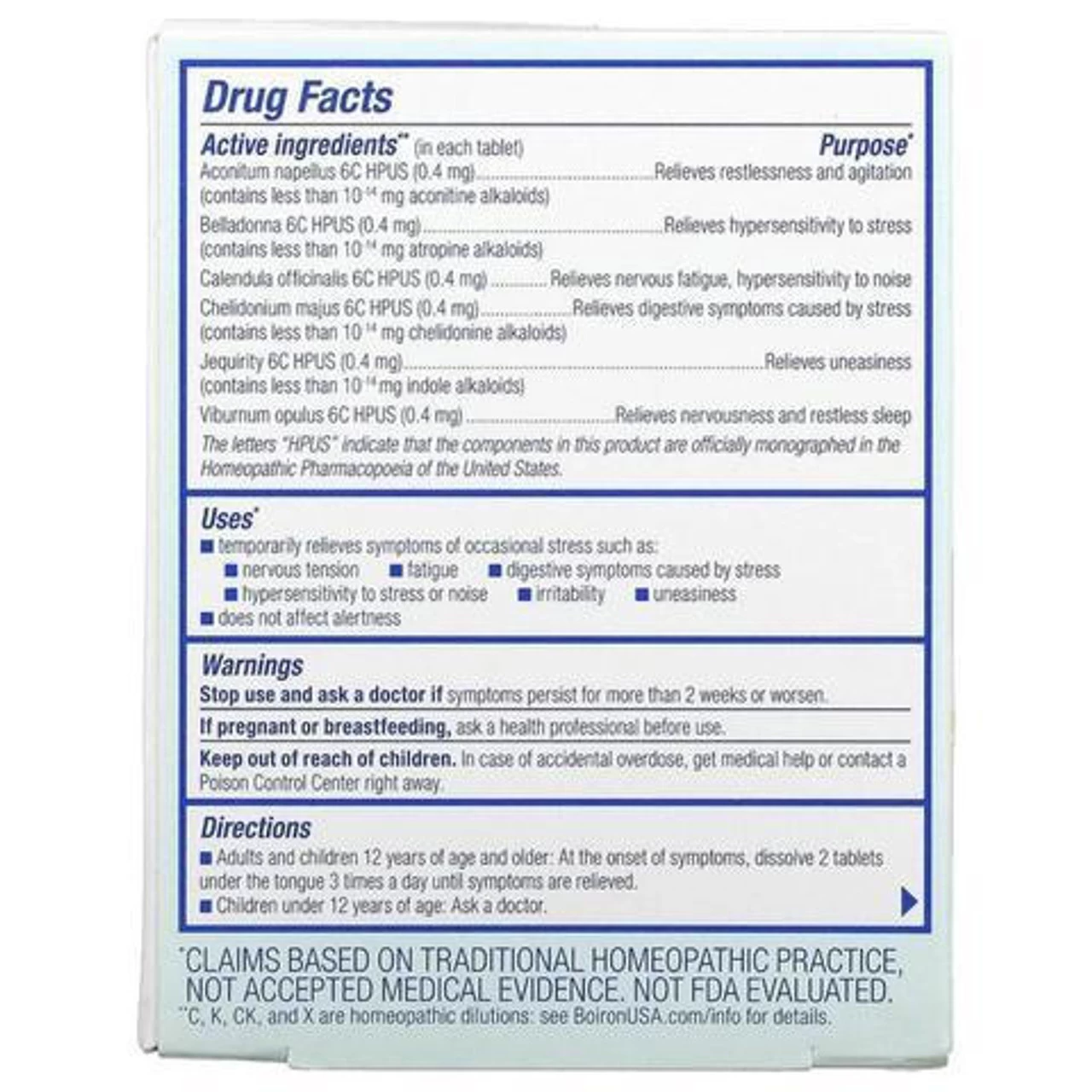 Boiron StressCalm provides relief for occasional nervousness, irritability, hypersensitivity, and fatigue due to everyday stress as well as nervous tension, calming both mind and body. It helps you stay focused and relaxed without affecting alertness. It is commonly used before performing, public speaking, taking a test, or flying.